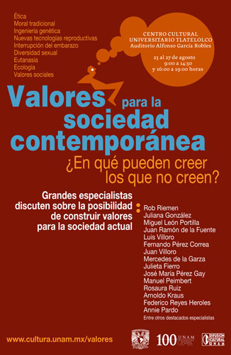Con la premisa central de revivir la gran tradición de la cultura humanista, la UNAM organiza el Coloquio Valores para la sociedad contemporánea cuyo objetivo es proponer una discusión informada acerca de uno de los temas centrales del mundo contemporáneo: la posibilidad de plantear un sistema de valores y una ética adecuados a nuestros días. Este evento es un excelente espacio para la reflexión, y cabe agregar que entre los intelectuales participantes, sobresalen varios de nuestros filósofos y promotores de la filosofía.