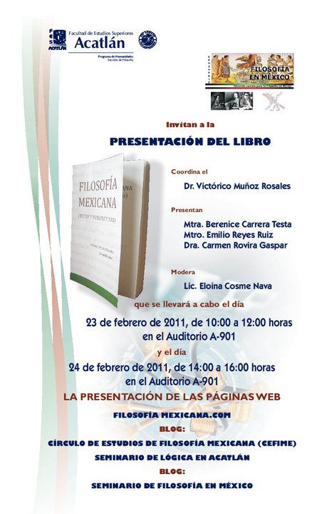 Un día antes, la FES también acoge la presentación del libro Filosofía Mexicana. Retos y perspectivas, coordinado por el Dr. Victórico Muñoz Rosales. Presentan: Mtra. Berenice Carrera Testa, Mtro. Emilio Reyes Ruiz, Dra. Carmen Rovira Gaspar.