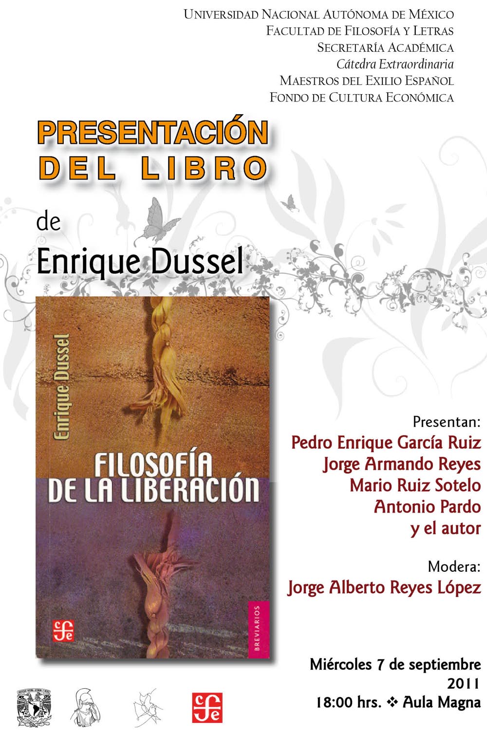 «Filosofía de la liberación anticipó la crítica al eurocentrismo y a la modernidad que en su momento Edward Said y J.F Lyotard abordaron con gran detalle. Ofrece con lucidez un programa de investigación filosófica que descentra las referencias dominantes, levantándose contra el machismo, el fetichismo, la ideología pedagógica occidental y los fundamentalismos. A la distancia fue la primera respuesta intelectual que permitió vislumbrar el discurso de una nueva forma de pensar que todavía está vigente en nuestros días. Enrique Dussel propone una filosofía basada en el diálogo y la atenta escucha a los excluidos, al «Otro radical», es decir, al sujeto que ha sido convertido en objeto por la dominación occidental y que se mueve en la periferia. El tema de esta filosofía trasciende fronteras porque toca aspectos relativos al ser humano, su historia y la realidad de la libertad. » / FCE