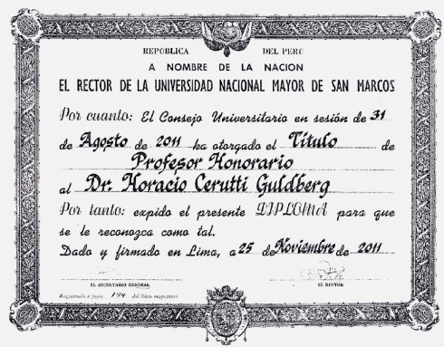 La Universidad Nacional Mayor de San Marcos ha reconocido con el Título de Profesor Honorario al filósofo mexico-argentino Horacio Cerutti-Guldberg en la ciudad de Lima, Perú.