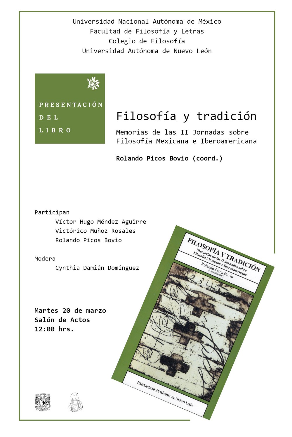 Agenda Presentación del libro «Filosofía y tradición. Memorias de las II Jornadas sobre Filosofía Mexicana e Iberoamericana» Publicado por CEFIME el 18 marzo, 201210 agosto, 2012 Presentación del libro «Filosofía y tradición. Memorias de las II Jornadas sobre Filosofía Mexicana e Iberoamericana» 12:00 p.m. Salón de Actos FFyL-UNAM. A cargo de Rolando Picos Bovio, Víctor Hugo Méndez Aguirre y Victórico Muñoz Rosales. Tu voto:¡Comparte! Haz clic para enviar un enlace por correo electrónico a un amigo (Se abre en una ventana nueva) Correo electrónico Haz clic para imprimir (Se abre en una ventana nueva) Imprimir Haz clic para compartir en Facebook (Se abre en una ventana nueva) Facebook Haz clic para compartir en X (Se abre en una ventana nueva) X Haz clic para compartir en LinkedIn (Se abre en una ventana nueva) LinkedIn Haz clic para compartir en Pinterest (Se abre en una ventana nueva) Pinterest Haz clic para compartir en Tumblr (Se abre en una ventana nueva) Tumblr Haz clic para compartir en Reddit (Se abre en una ventana nueva) Reddit Me gusta Cargando... Relacionado