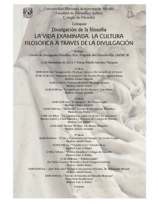 El Círculo de Divulgación Filosófica de la Facultad de Filosofía y Letras, y el Posgrado en Filosofía de la Facultad de Filosofía y Letras y del Instituto de Investigaciones Filosóficas de la UNAM invitan al Coloquio de divulgación de la filosofía «La vida examinada. La cultura filosófica a través de la divulgación» este lunes 12 de noviembre de 2012 en el Anexo Adolfo Sánchez Vázquez en CU, que iniciará a partir de las 10 am.