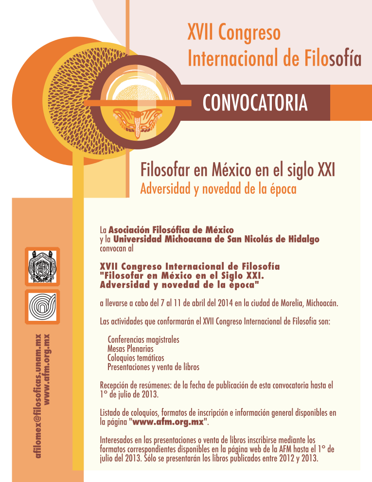 Agenda Convocatoria: XVII Congreso Internacional de Filosofía de la AFM Publicado por CEFIME el 10 mayo, 201315 mayo, 2013 Follow @FilosofiaMexico El Consejo Directivo de la Asociación Filosófica de México, A.C. convoca al XVII Congreso Internacional de Filosofía Filosofar en México en el siglo XXI Adversidad y novedad de la época Que se realizará del 7 al 11 de abril de 2014, en la Ciudad de Morelia, Michoacán Más información: Asociación Filosófica de México Follow @FilosofiaMexico Tu voto:¡Comparte! Haz clic para enviar un enlace por correo electrónico a un amigo (Se abre en una ventana nueva) Correo electrónico Haz clic para imprimir (Se abre en una ventana nueva) Imprimir Haz clic para compartir en Facebook (Se abre en una ventana nueva) Facebook Haz clic para compartir en X (Se abre en una ventana nueva) X Haz clic para compartir en LinkedIn (Se abre en una ventana nueva) LinkedIn Haz clic para compartir en Pinterest (Se abre en una ventana nueva) Pinterest Haz clic para compartir en Tumblr (Se abre en una ventana nueva) Tumblr Haz clic para compartir en Reddit (Se abre en una ventana nueva) Reddit Me gusta Cargando... Relacionado