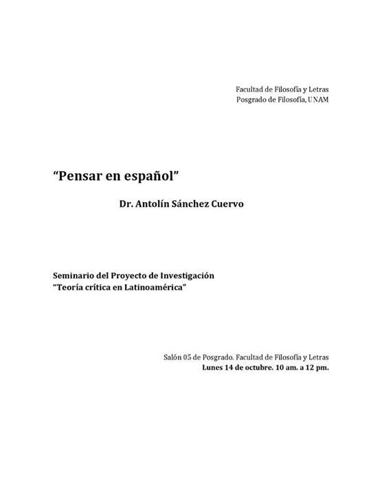 El seminario del Proyecto de Investigación «Teoría crítica en Latinoamérica» del posgrado de Filosofía en la FFyL, UNAM, invita a la conferencia «Pensar en español» del Dr. Antolín Sánchez Cuervo .