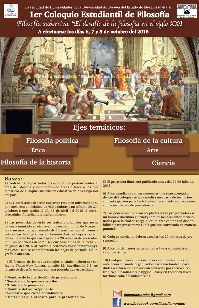 Convocatorias Convocatoria Primer Coloquio Estudiantil de Filosofía: «Filosofía subversiva: el desafio de la filosofía en el siglo XXI» Publicado por CEFIME el 25 marzo, 201526 marzo, 2015 La Facultad de Humanidades de la Universidad Autónoma del Estado de Morelos invita al Primer Coloquio Estudiantil de Filosofía: «Filosofía subversiva: el desafio de la filosofía en el siglo XXI» A realizarse los días 6,7 y 8 de octubre del 2015 Último día de recepción de trabajos: 15 de abril de 2015 al correo filosofiamorelos@gmail.com Tu voto:¡Comparte! Haz clic para enviar un enlace por correo electrónico a un amigo (Se abre en una ventana nueva) Correo electrónico Haz clic para imprimir (Se abre en una ventana nueva) Imprimir Haz clic para compartir en Facebook (Se abre en una ventana nueva) Facebook Haz clic para compartir en X (Se abre en una ventana nueva) X Haz clic para compartir en LinkedIn (Se abre en una ventana nueva) LinkedIn Haz clic para compartir en Pinterest (Se abre en una ventana nueva) Pinterest Haz clic para compartir en Tumblr (Se abre en una ventana nueva) Tumblr Haz clic para compartir en Reddit (Se abre en una ventana nueva) Reddit Me gusta Cargando... Relacionado