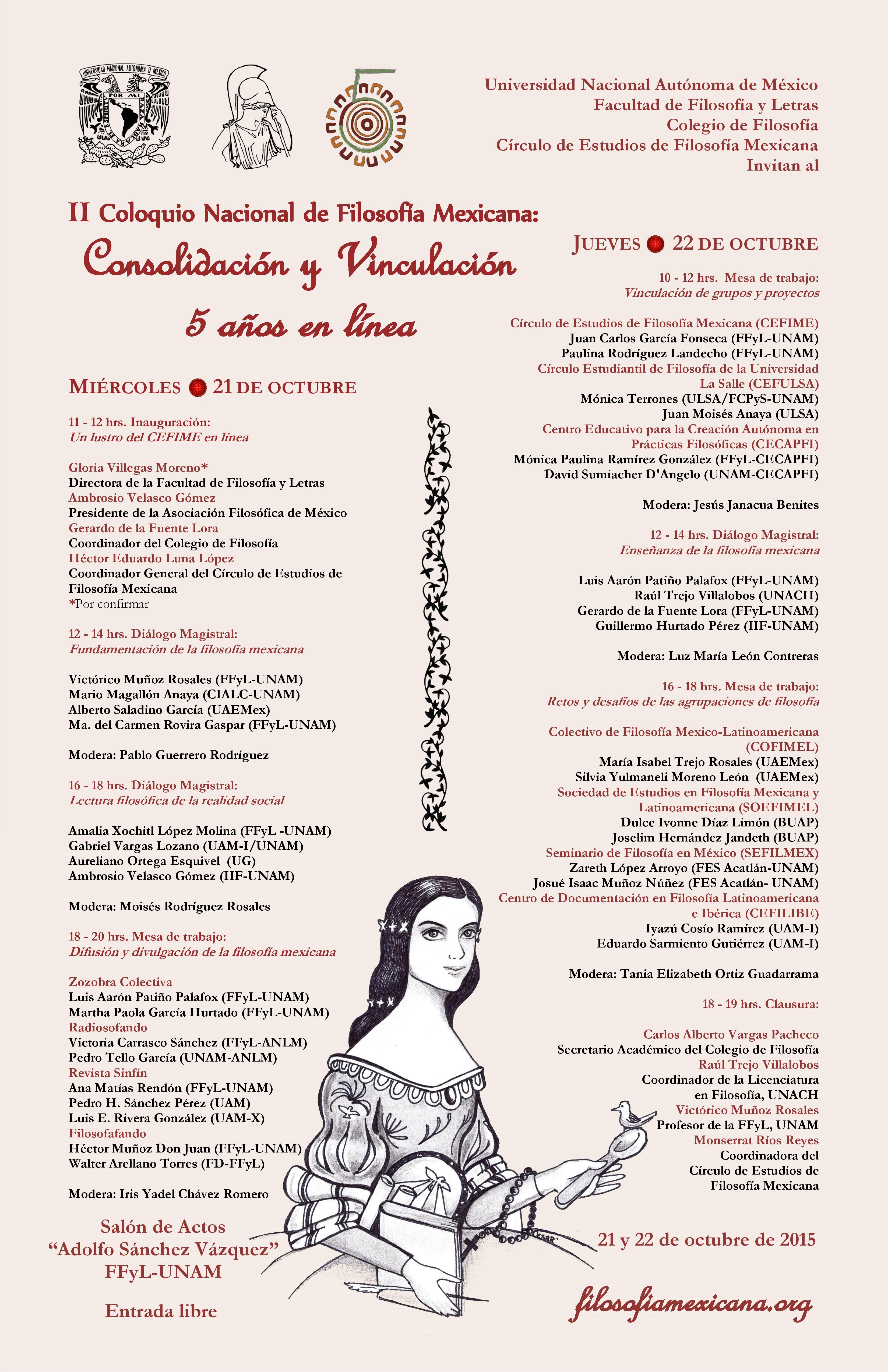El próximo 21 y 22 de octubre, y gracias al apoyo del Colegio de Filosofía de la Facultad de Filosofía y Letras de la UNAM, se llevará a cabo el II Coloquio Nacional de Filosofía Mexicana que lleva por título Consolidación y vinculación. 5 años en línea. Con este evento, que se realizará en el Salón de Actos “Adolfo Sánchez Vázquez” de la mencionada facultad, estaremos festejando 6 años de trabajo ininterrumpido y 5 de presencia en línea como Círculo de Estudios de Filosofía Mexicana (CEFIME).