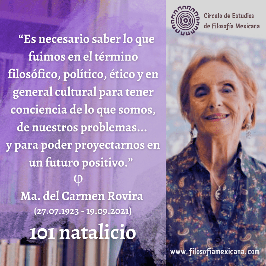 En su 101 natalicio, recordamos con admiración y reconocimiento a nuestra maestra María del Carmen Rovira Gaspar, quien nos dejó trazada la senda de la investigación en filosofía mexicana y un corpus robusto de ideas, metodologías y argumentos a favor de la autonomía del pensamiento propio y el compromiso de la filosofía con la causa más justa a la que se puede aspirar: el respeto a la dignidad humana.