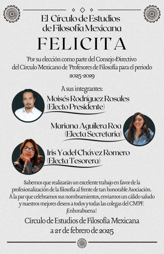 Celebramos con entusiasmo la incorporación de nuestros amigos y colegas Moisés Rodríguez, Mariana Aguilera e Iris Yadel Chávez, al Consejo Directivo del Círculo Mexicano de Profesores de Filosofía A.C., para el periodo 2025-2029. Este es un reconocimiento a su compromiso con la enseñanza y el desarrollo del pensamiento filosófico en México.