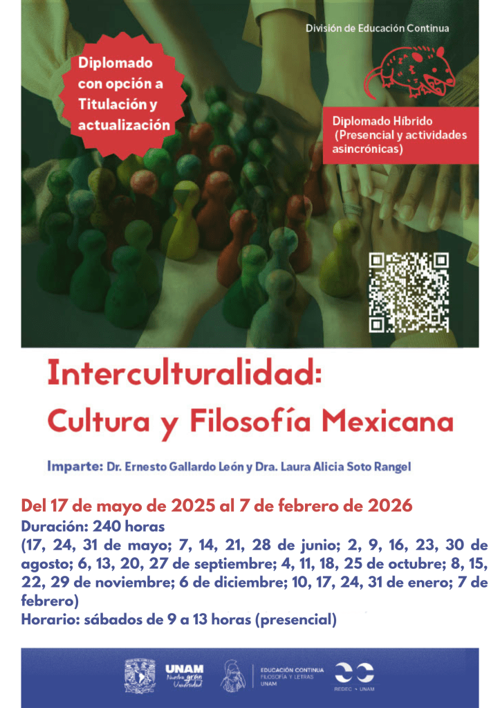 ACTUALIZACIÓN: Se ha extendido el periodo de inscripciones al «Diplomado de Interculturalidad: Cultura y Filosofía Mexicana», 2a edición, FFyL, UNAM. Asimismo, se han actualizado las fechas de inicio y término del diplomado. Revisa detalles a continuación: