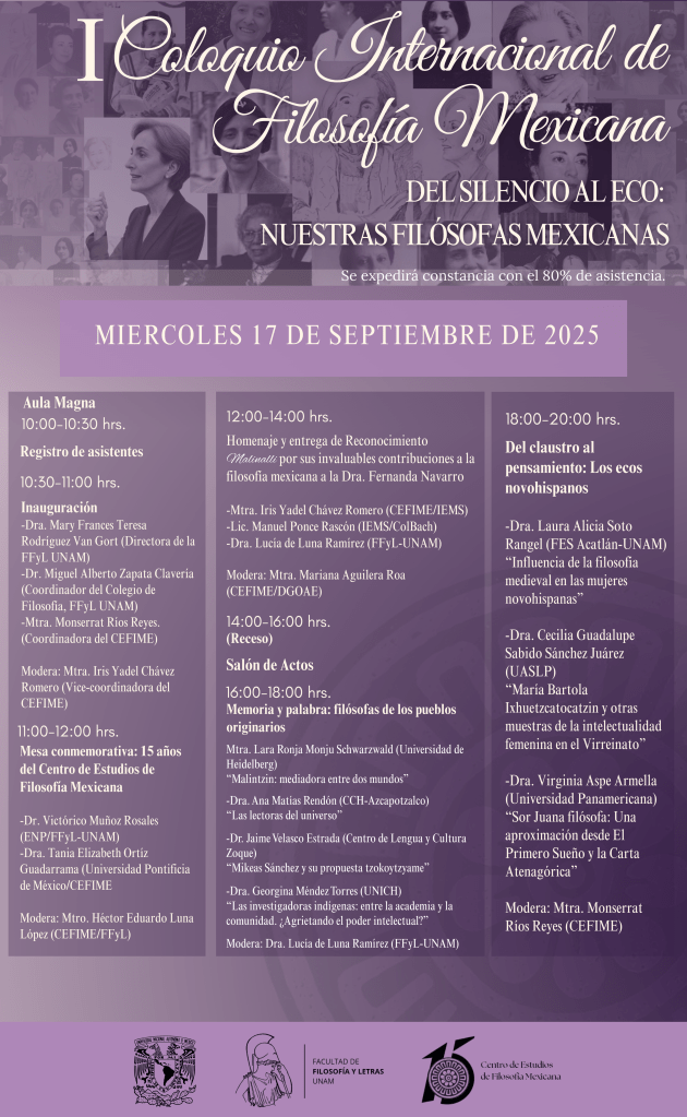 Esperamos contar con su valiosa presencia en las instalaciones de la Facultad de Filosofía y Letras de la UNAM o en las transmisiones en línea a través de nuestras redes sociales.