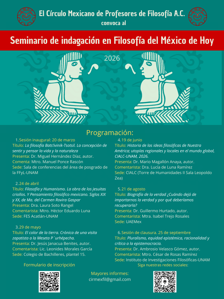 El Círculo Mexicano de Profesores de Filosofía A.C. invita al Seminario de indagación sobre Filosofía del México de Hoy, que tendrá presencia del CEFIME.