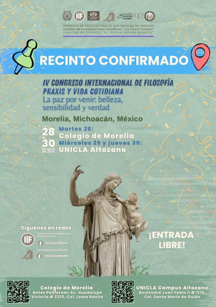 La Universidad Michoacana de San Nicolás de Hidalgo, el Instituto de Investigaciones Filosóficas «Luis Villoro Toranzo» y la Facultad de Filosofía «Dr. Samuel Ramos Magaña», invitan al